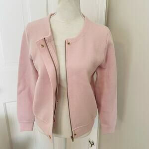 Pink zippered sweater jacket. Warm and chic. Gold accents.