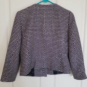 Striking Navy, Black, Cobalt, and Ivory basket weave tweed. Beautiful Silver & gold sparkling threads.