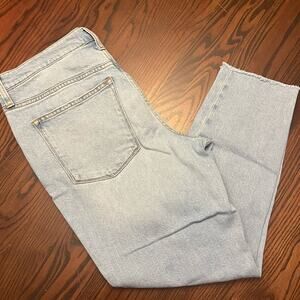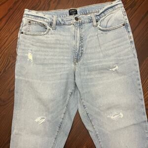 J. Crew light wash mid rise skinny jeans. Distressed holes and raw hems. Size 30