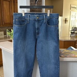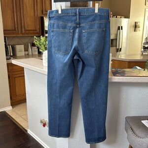 Easy through the hip and thigh, with a slouchy, straight leg. Inseam is 31” and is a size 33” waist. Jeans are like new!!