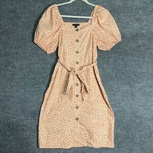 Features: woven dress, pink-orange leopard print, square neck, button up front, puff short sleeves, optional belted waist, A-line silhouette, unlined
