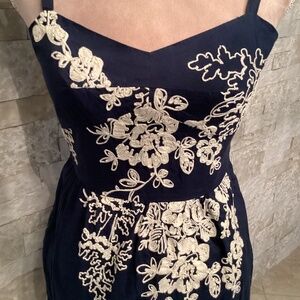 This cute dress is the J.Crew Mirabel garden lawn navy blue cotton embroidered dress. It features adjustable spaghetti straps, a back zipper, hidden side pockets, and delicate pom-pom trim on the bottom hem.