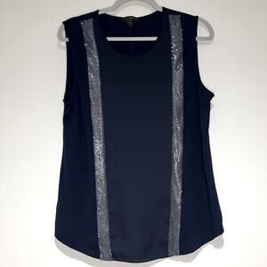 J. Crew Mixed Media w/ Metal Sequin Trim Sleeveless Blouse Size M Navy Cotton