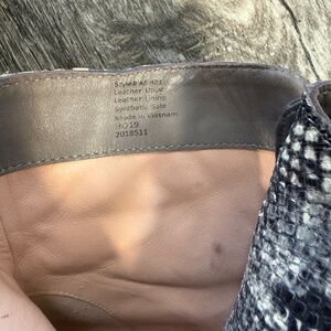 This walkable boot features four decorative buckles and a side zipper. Leather upper and lining/synthetic sole. Very gently used. Snake Print leather.