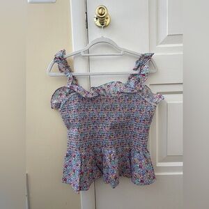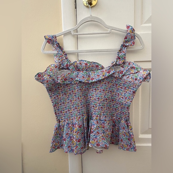 Chic floral blouse with ruffle details. Vibrant multicolor design. Ideal for casual outings.