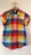 Vibrant plaid design. Short sleeves. Button-up front. Casual and stylish.