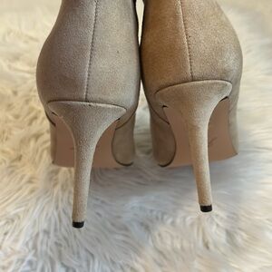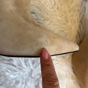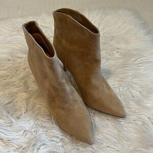 Supple suede booties with pointed toe and covered 3.5” heel. These appear to be unworn but have a few minor marks on the right shoe, see photos. Marker on the sole of the left, not visible when wearing.