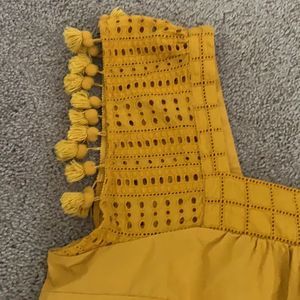 Adorable J. Crew mustard golden yellow eyelet top. Pom pom fringe detail at shoulders. Elastic on back neckline. Small loop snaps on inside of straps to prevent brastraps from showing. Measures approx. 21” pit to pit laying flat and approx. 18.75” from top of neckline to bottom hem. Good pre-owned condition. Please see all detailed photos provided in listing. Women’s Sz 14