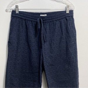 New with tag J. Crew Mercantile navy blue eyelet pants. Pull on with drawstring closure. Lined, elastic waist and has pockets. Ankle length. Size small.