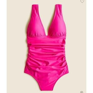 J Crew NWT Ruched One Piece Deep V Neck Bright Pink Swimsuit Size 8