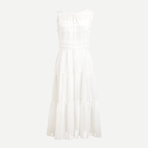 J. Crew Tiered Midi Dress in Striped Clip Dot Ivory size Small. How we're getting dressed these days- in classic one-and-done dresses with a few special details—like a tiered skirt and a subtle dot print. Sheer yoke. Sleeveless. Back zip. Pockets. Lined. Model photos added to illustrate fit, not color- actual dress is Ivory. New with tag attached.