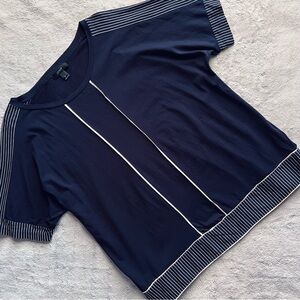 Great used condition. Striped Cotton Pullover Top by J. Crew in navy blue with white detailing. Nautical preppy aesthetic, a versatile piece that can be dressed up with trousers for the office or worn casually with denim. Boxy pullover top with round neckline and relaxed, easy fit. Longer short sleeves. Cotton jersey fabric with piped detail and striped panels at sleeves and bottom hem, see video. 100% cotton. Size medium, see photos for measurements.
