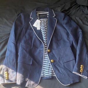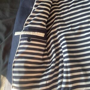 Stylish navy blazer with gold buttons. Features white piping and striped lining. Perfect for a polished look.