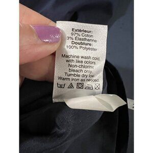 This navy blue sheath dress is designed with a flattering silhouette and short sleeves, ideal for an elegant or professional look. The dress features a convenient zipper closure at the back and is crafted from a comfortable cotton blend material.