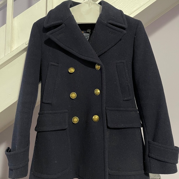 Classic navy wool-blend peacoat with statement gold buttons and a tailored silhouette. Structured lapel, flap pockets, and clean lines give it a sophisticated, Parisian-inspired feel.