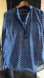 Elegant navy blouse with white polka dots. Features a stylish neckline. Ideal for versatile wear.