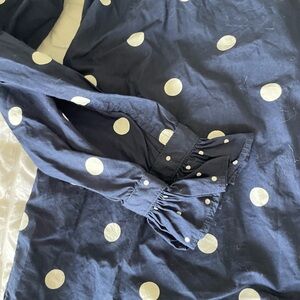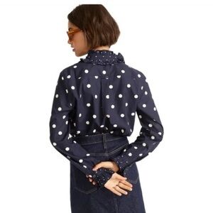 Stylish navy blouse with white polka dots. Button-up front. Long sleeves with cuff details. Perfect for casual or office wear.