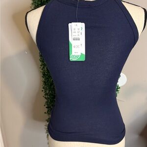Sleek navy ribbed tank with a fitted silhouette. Crew neckline and sleeveless cut for layering. Soft stretch fabric for comfortable wear. Casual essential that pairs with denim or skirts.