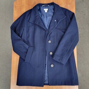 Women's navy wool blend short coat by J. Crew. Single breasted button front coat with slash pockets. The hidden button placket gives the coat a clean look.