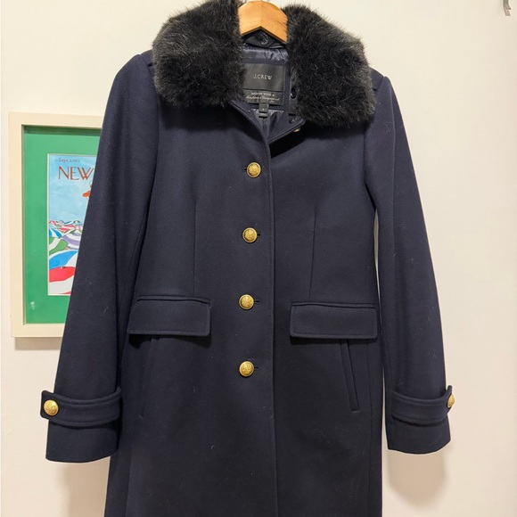 J. Crew Navy Wool Pea Coat with Black Faux Fur Collar Size 6