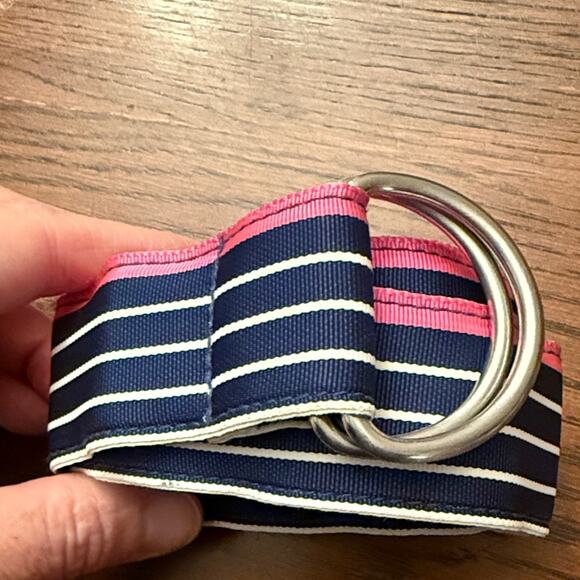 J. Crew Navy and Pink Striped Belt with Silver Rings L/XL
