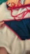 Stylish navy bikini with vibrant red trim. Triangle top with wrap around ties and matching bottoms. Perfect for beach days.