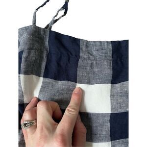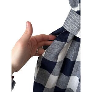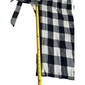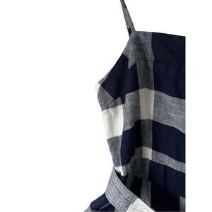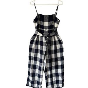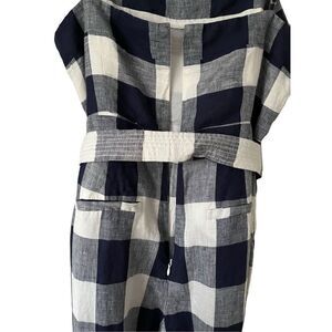 Stylish checkered jumpsuit. Features navy and white pattern. Sleeveless with a belted waist. Perfect for casual outings.