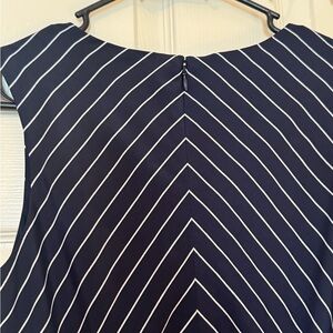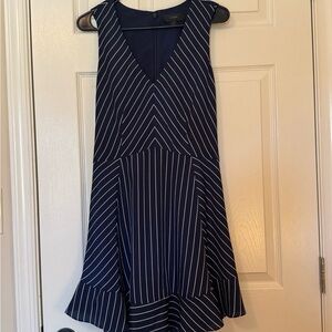 Stylish mini dress with navy and white stripes. Features a V-neck and flared hem. Perfect for casual outings.