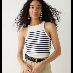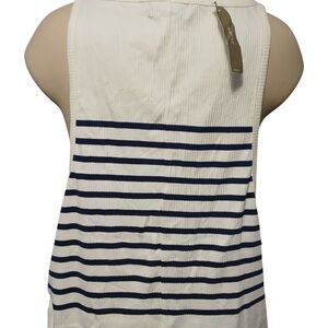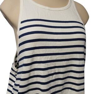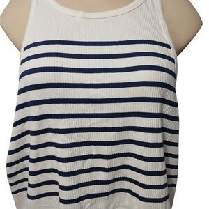 Stylish tank top with navy stripes. Sleeveless and versatile. Ideal for casual wear.