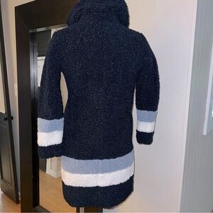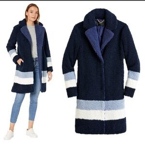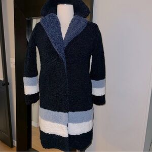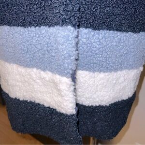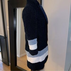 Stylish teddy jacket by J. Crew. Features navy, light blue, and white stripes. Cozy and chic design.