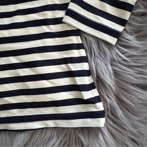 Classic navy and white striped design. Long sleeves. Comfortable fit. Zipper back.