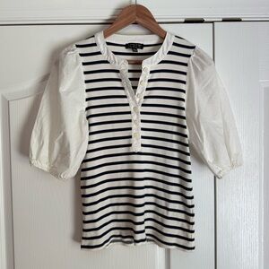 J Crew navy and cream stripe top with puff sleeves. Buttons on front. Stretchy ribbed material on body. Puff sleeves have elastic at cuff. Comes from a smoke free home. Open to offers and happy to bundle!