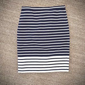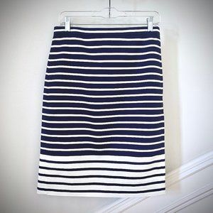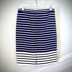 Classic J. Crew pencil skirt in a navy and white stripe with a reverse stripe detail at hem. Like new condition with no flaws. 100% cotton in textured basket weave, and fully lined in polyester. This is NOT a J. Crew factory item. Hidden back zip and back kick pleat. Flat measurements: Waist = 15", Hips = 19", Length = 23.5". Dry clean.