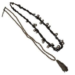 One is a junk necklace with a mult strand look. One chain is medium antique gold tone with faux pearls. One has a black tone with Diamond rhinestones.