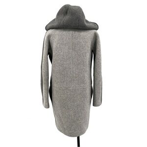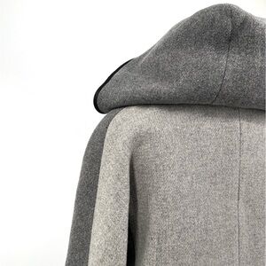 Check out this amazing coat made by J Crew. This is a size 2, it's made from a wool/nylon blend. It is a hooded style with a zip front & long sleeves, it is above knee length on most. It's color block stadium cloth in grays with a touch of black leather contrast trim, it has 2 front pockets and it is fully lined. This was worn maybe a handful of times, it's in very excellent condition.