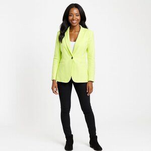 The vibrant chartreuse hue taps into major 2024–2025 color trends (hello dopamine dressing!) and the clean silhouette makes it an ideal layering piece for both professional and casual looks.