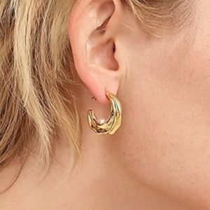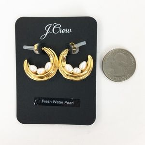 J. Crew Anya Nested Fresh Water Pearl Hoop Earrings. Style #BB489. Brass, gold plating, fresh water cultured pearls. Hypoallergenic ear posts. Care recommendations from J. Crew: Remove item before shower or exercise and put on after applying hair products or perfume. To clean, polish with a soft, dry cloth. Store in a pouch or jewelry case.