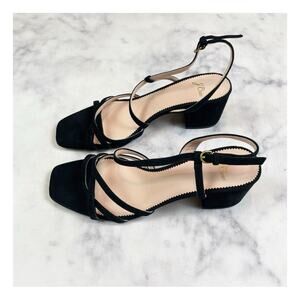 black Odette Suede Strappy Block Heel Sandals from J. Crew. square toe, buckle closure. approx 2.5” covered heel. style # AN890. leather upper and lining with synthetic sole. EUC - like new - worn only once - no flaws.