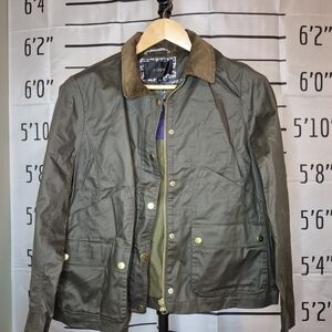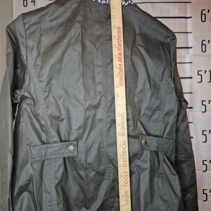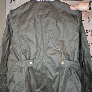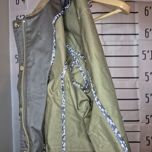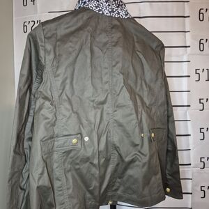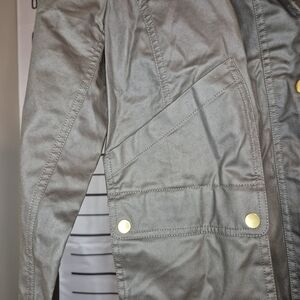 Stylish olive green jacket. Features a brown collar. Gold button accents. Perfect for layering. In excellent condition! Only worn once and not the right fit for me sadly.