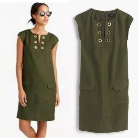 J. Crew Olive Green Linen Shift Dress Gold Grommet Detail Style F1836 Size 8