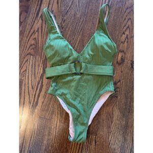 J.Crew swimsuit, belted one-piece swimwear, ribbed texture suit, olive green swimsuit, classic minimalist swim style, modern resortwear, vacation beach look, timeless chic swim, sleek feminine silhouette, structured ribbed design, luxury swimwear aesthetic, elevated poolside look, elegant summer staple, capsule wardrobe swimwear, neutral tone swimsuit, sophisticated resort fashion, flattering belted suit