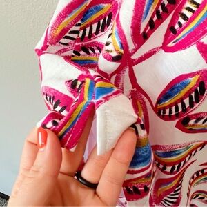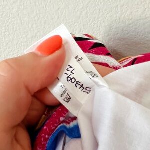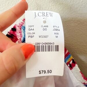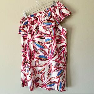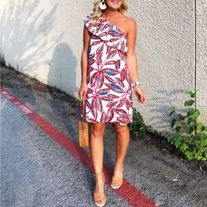 Brand new with tags J. Crew One-Shoulder Dress in white and pink tropical floral print. Size medium. Ruffle detail at neckline. Linen/cotton blend. Lined. Knee length. Retailed for $79.50. NWT- writing on interior care tag.