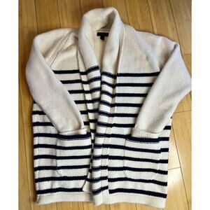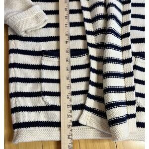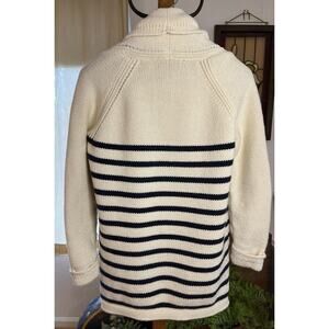 This is a J.CREW cardigan sweater in size Small, featuring a striped design in white with blue stripes. It has a chunky-knit, collared neckline with long sleeves and a relaxed fit. Made of a blend of nylon, cotton, and merino wool, this sweater is perfect for winter, fall, and spring. It is designed with a fisherman core theme and includes pockets, making it ideal for travel, casual wear, and work attire.