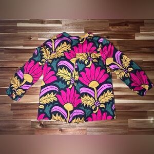 Materials and measurments in photos. Please note, there are two small dots on the front left lapel (when wearing). Item is new and has not been washed. May come out when laundered but the print is so busy, the spots are not easily spotted. See photos for details to ensure your satisfaction before purchasing.