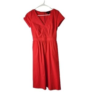 J. Crew orange midi dress in size 00. Features a crossover v-neck bust, zipper down the back, and pockets. 98% cotton, 2% elastane. Great pre-loved condition. Approximate flat lay measurements are shown in the photos. Sold as pictured.