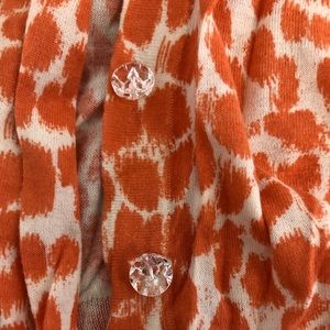 Used J Crew Neon orange animal print cardigan. Hole near the tag. See pictures. Tag is faded but looks like a large. Dog friendly home.