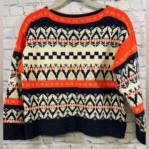 J Crew Orange Navy Festive Holiday Aspen Chic Nordic Preppy Fair Isle Sweater S