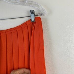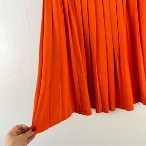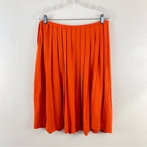 Vibrant orange midi skirt. Features pleated design. Perfect for any occasion.