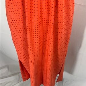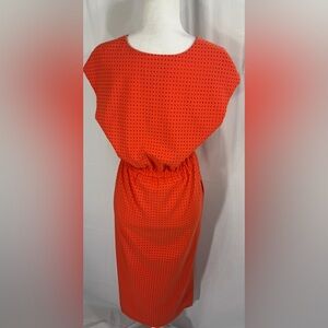 Chic orange dress with a flattering V-neck. Features a subtle dotted pattern. Ideal for versatile styling. Gently used Preowned condition.