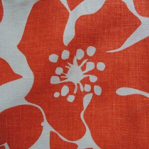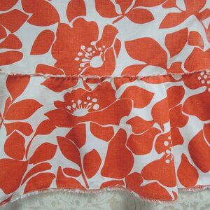 J. Crew orange & white linen trumpet skirt, size 8. Vibrant skirt is 100% linen, with natural slubs, in white with a floral orange print. Fitted through hips, then falling in classic A-line to wide trumpet ruffled tier at lower portion. Grosgrain ribbon detail at waist, rustic frayed edges at hem and ruffle, side zip closure. Cheerful and summery, with a classic vibe that works for professional or casual wear. EUC.